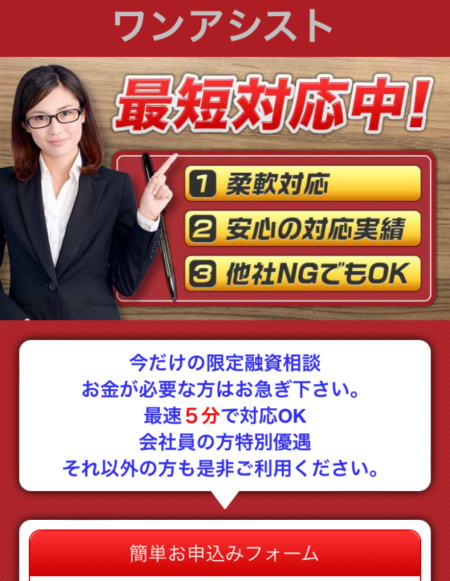 低金利9.6%~、即日融資最短15分手続き、100%融資!なんてありえない融資率を書いています(笑)