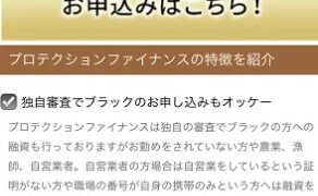 プロテクションファイナンスというスマホサイトで営業しているキャッシングの金融会社は闇金業者なので絶対に関わらないようにしてください!全国対応のネット完結独自審査で即日融資、ブラックのお申し込みもOK24時間365日いつでも可能なんて書いてい...